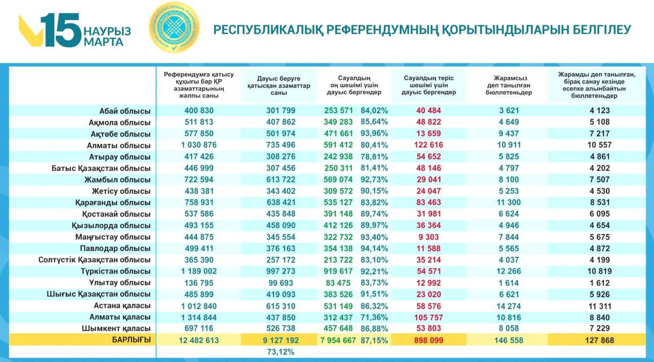 Стоит отметить региональную специфику: традиционно высокая протестная активность наблюдалась в Алматы, где против высказались 28,64% проголосовавших, в то время как регионы продемонстрировали консолидированную поддержку курса реформ.