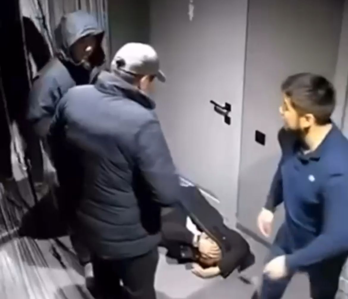 Бейнежазбада екі ер адам бір адамға шабуыл жасайды. Олардың бірі әсіресе қатты ұрып-соғады. Бір сәтте үшінші адам араласып, төбелесті тоқтатуға тырысса да, оған да соққы тиеді.