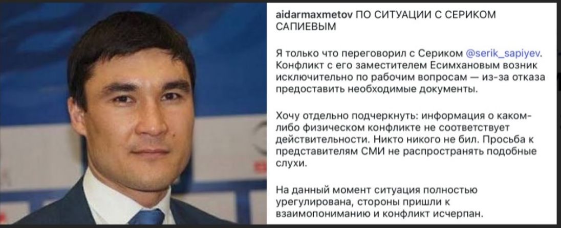 Президент Федерации дзюдо Астаны Айдар Махметов в своём Instagram прокомментировал ситуацию вокруг инцидента с участием олимпийского чемпиона Серика Сапиева и его заместителя Даурена Есимханова.